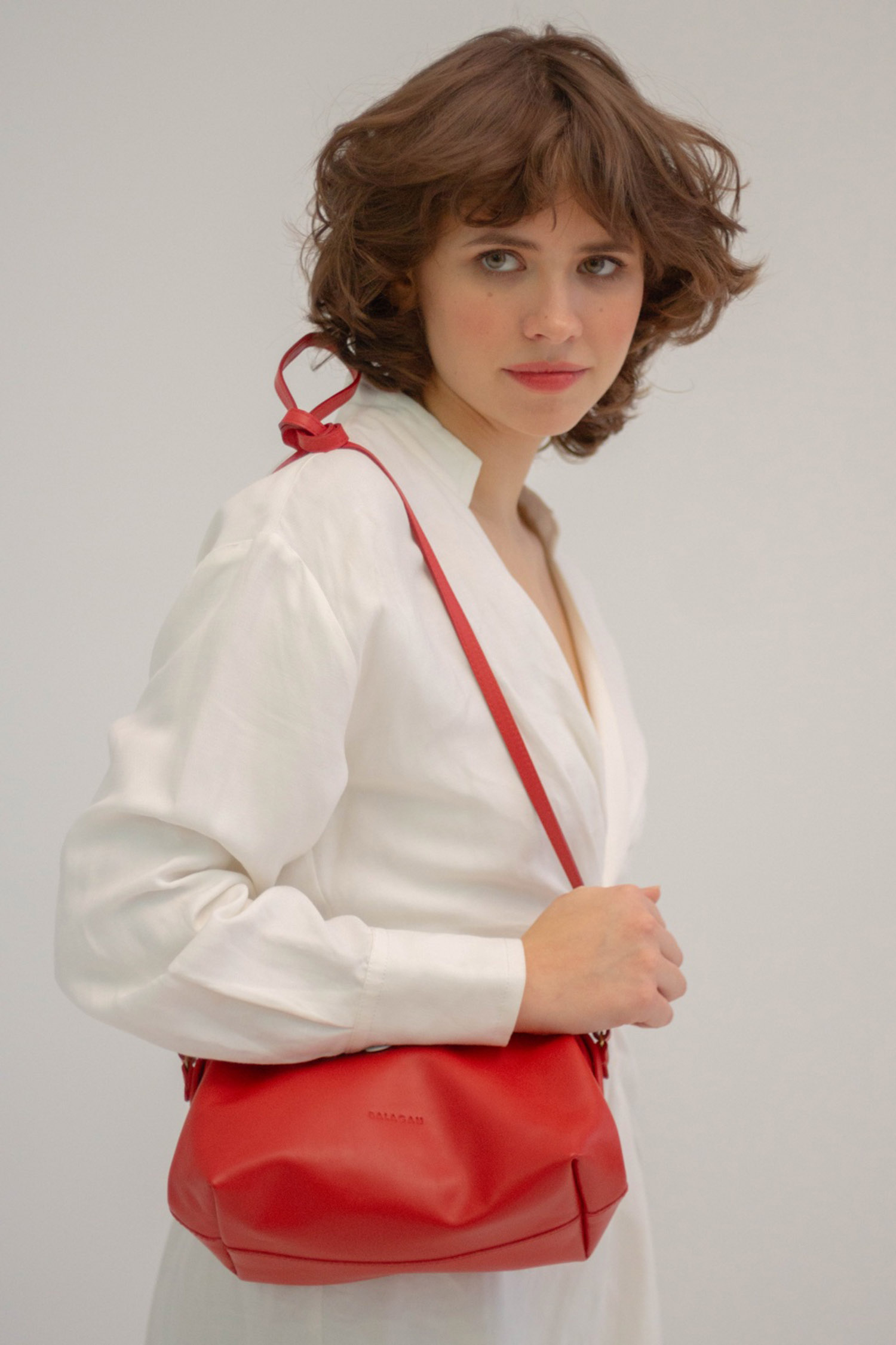 This classic bag is for everyday use and special occasions. Its elegant finish and iconic shape of the purse gives it a unique new vintage character. It has no lining or pockets, making it simple and minimalist. It has a long strap that you can adjust by tying a knot at your chosen height.