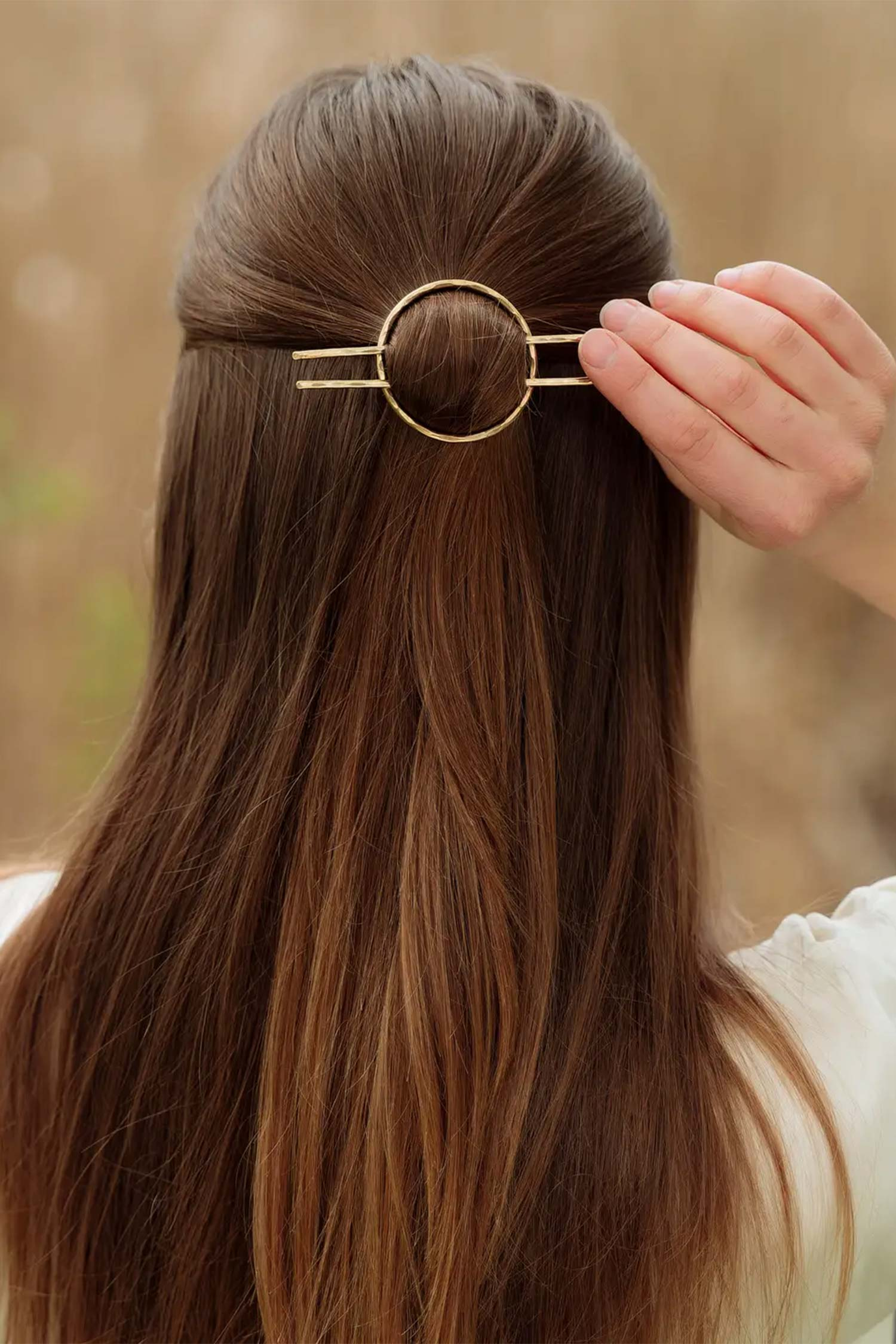 Diese minimalistische Haarspange aus starkem und robustem Draht hält selbst die dicksten Haarsträhnen an ihrem Platz. Jede Spange ist zu einem organischen Kreis geformt, verlötet, von Hand gehämmert und stundenlang getrommelt, um zusätzliche Festigkeit und einen schönen Glanz zu erzielen. Die 10 cm lange Gabel ist stark genug, um allein in einem Dutt oder einer französischen Hochsteckfrisur getragen zu werden.