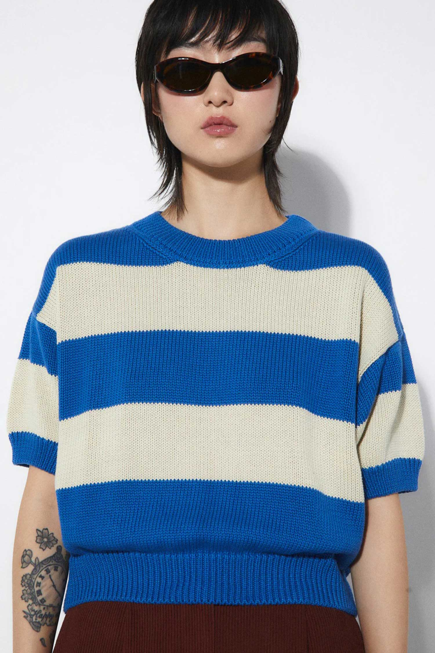 Kurz geschnittenes Oberteil aus Baumwollstrick mit kurzen Ärmeln und rundem Ausschnitt.