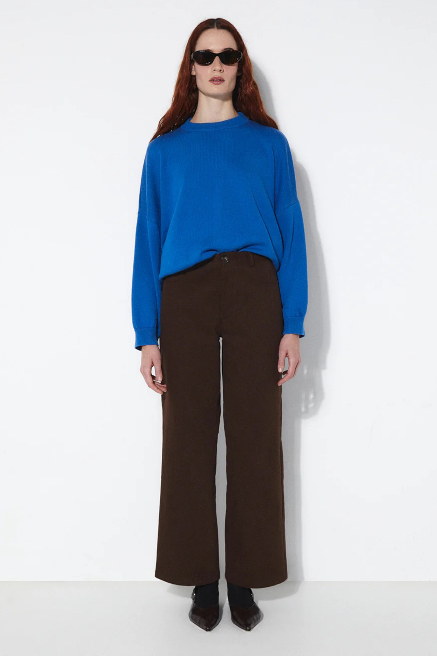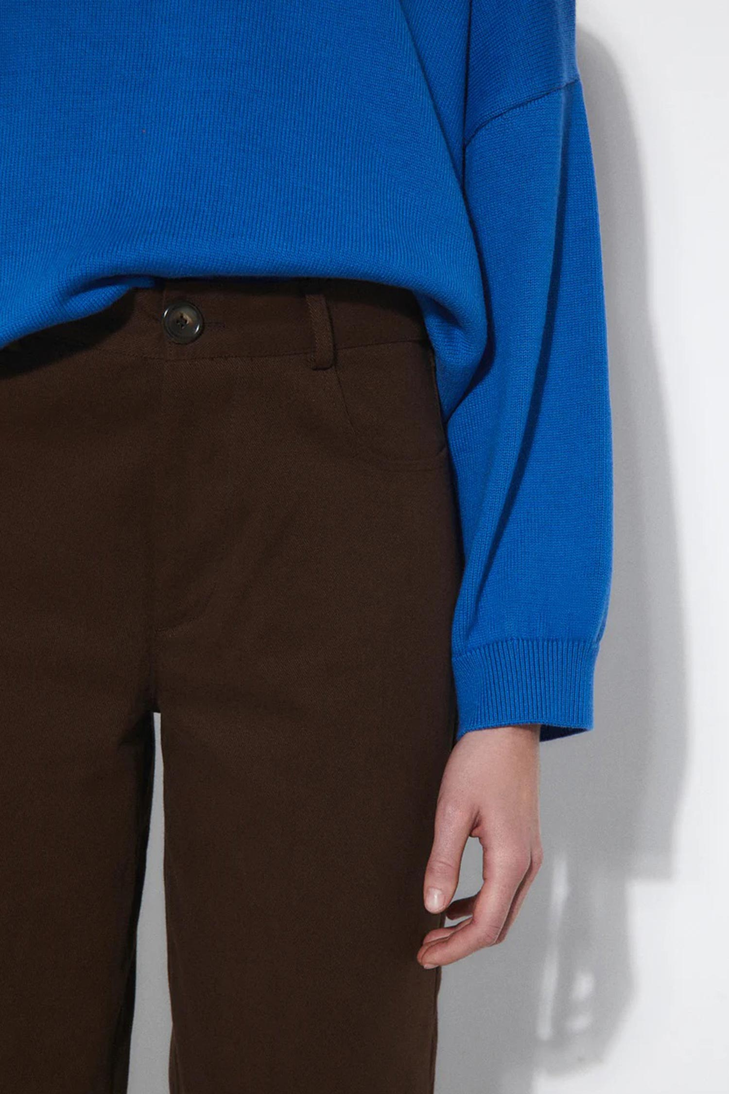 Five-pocket Hose aus hochwertigem Baumwoll-Canvas. Die Hose hat einen mittelhohen Schnitt mit weitem, geradem Bein.