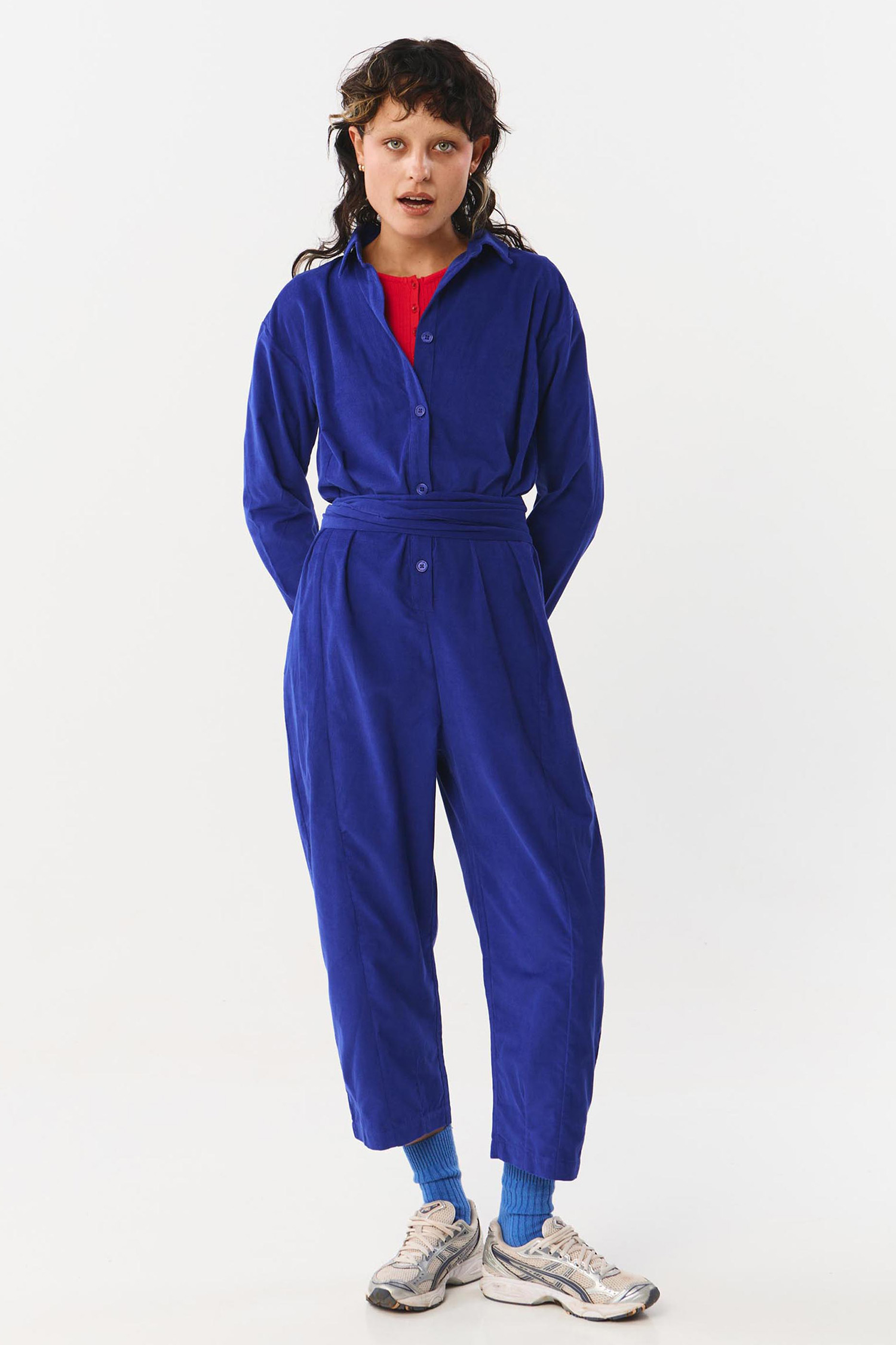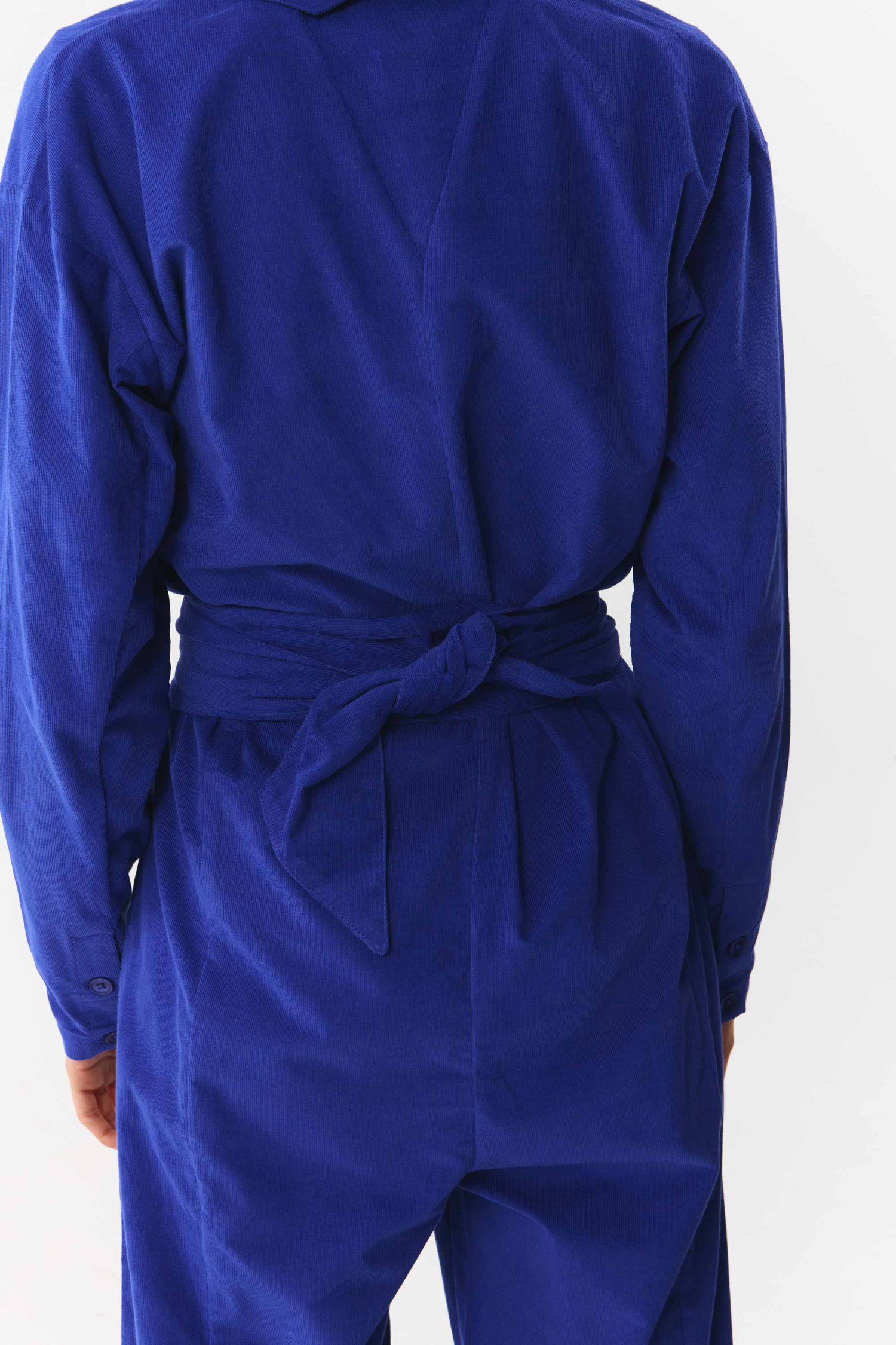 Jumpsuit aus Mikrocord mit Kragen und langen Ärmeln. Auf der Vorderseite mit Corozo Nussknöpfen und mit abnehmbarem Gürtel.