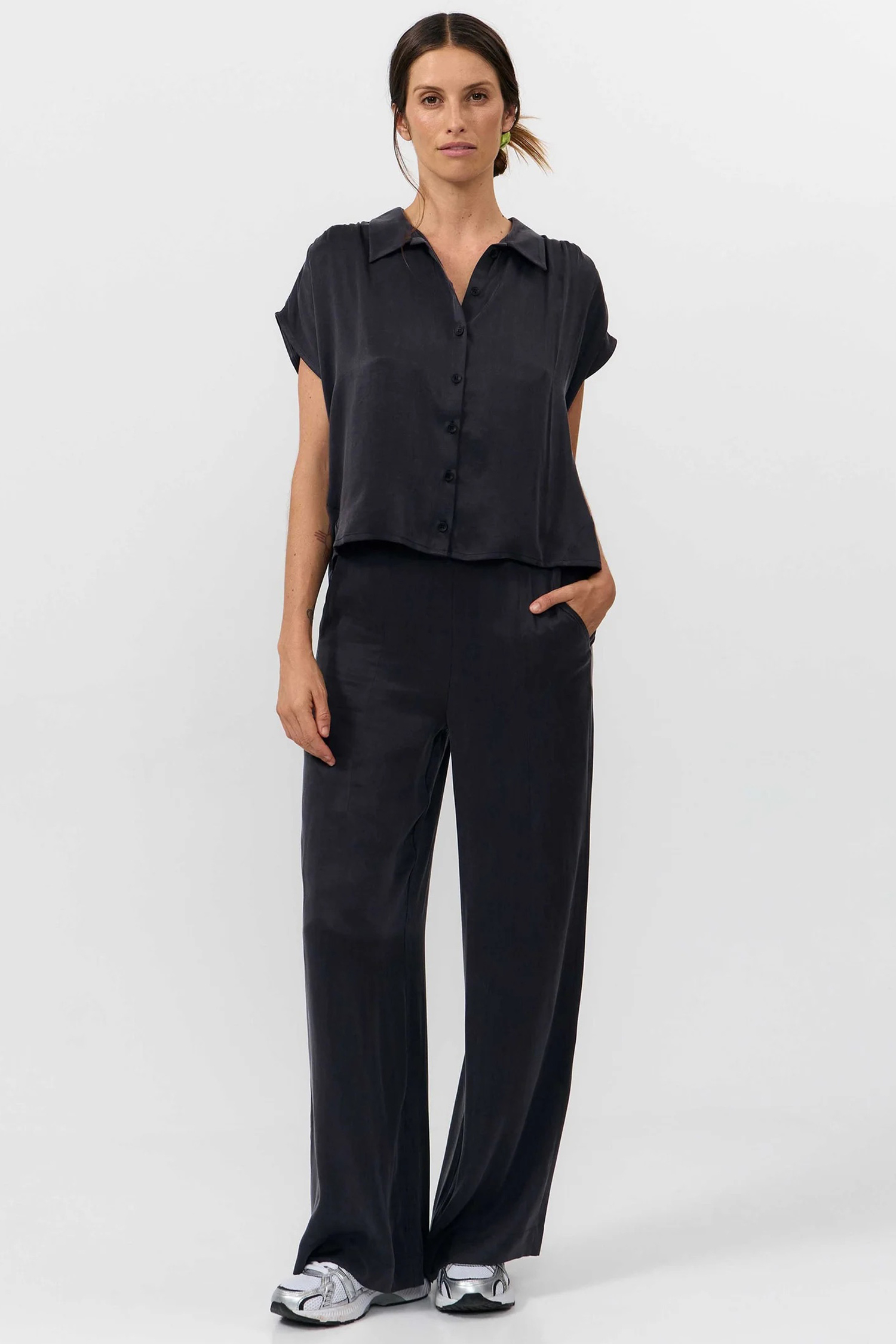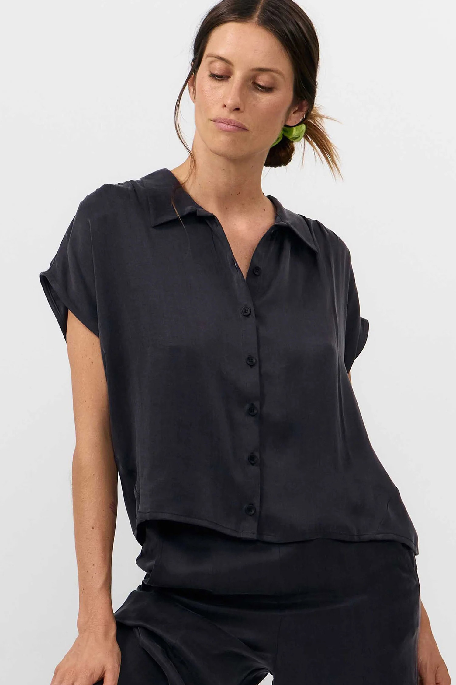 Cupro shirt with sleeves falling bellow the shoulder and gathered shoulder seam, closed up on front with corozo nut buttons.